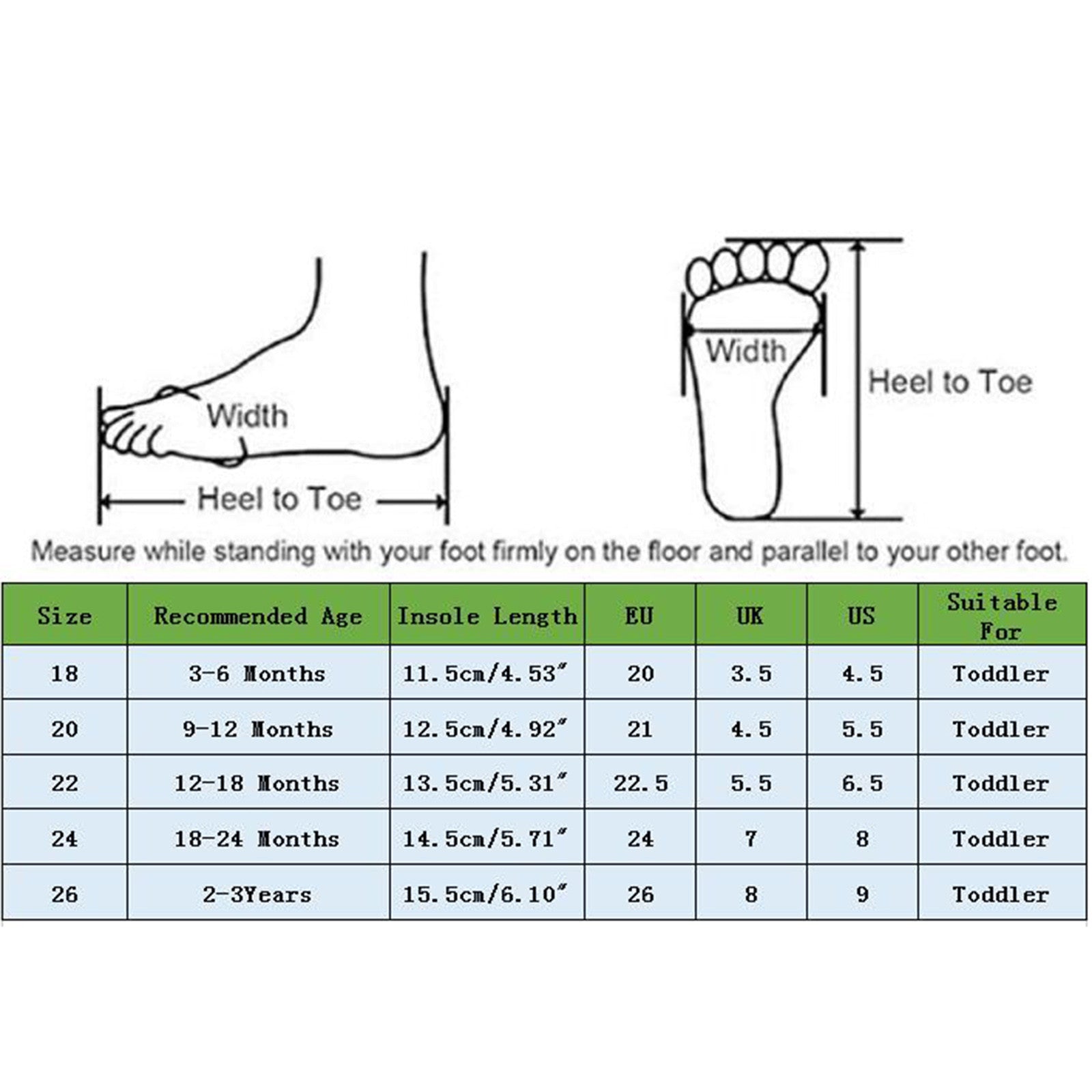 Inner length 11.5cm size 18/19, inner length 12.5cm size 20/21, inner length 13.5cm size 22/23, inner length 14.5cm size 24/25, inner length 15.5cm size 26/27